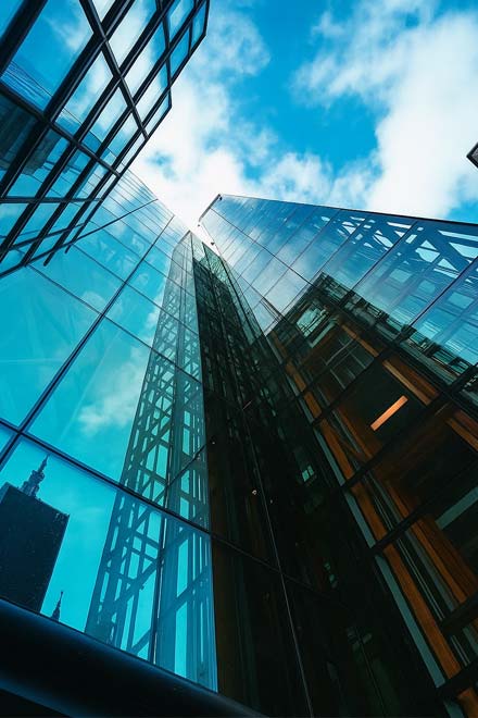 Reflective glass has a metallic coating that gives a mirror-like finish from the outside. It controls sunlight, reduces glare, and adds privacy to buildings.